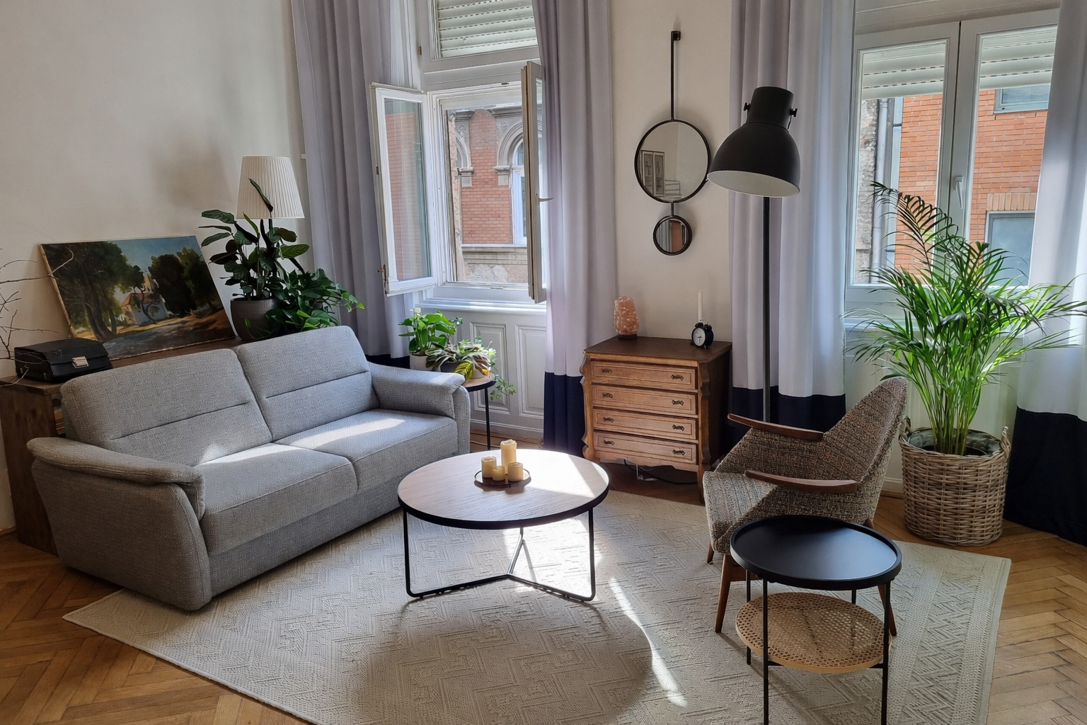 VI. kerületi, 75 nm-es polgári lakás frissítése, dekorálása értékesítés céljából. A fürdőszoba ugyan teljes körű felújításon esett át, de a lakás többi része csak esztétikai frissítést és stylingot kapott.